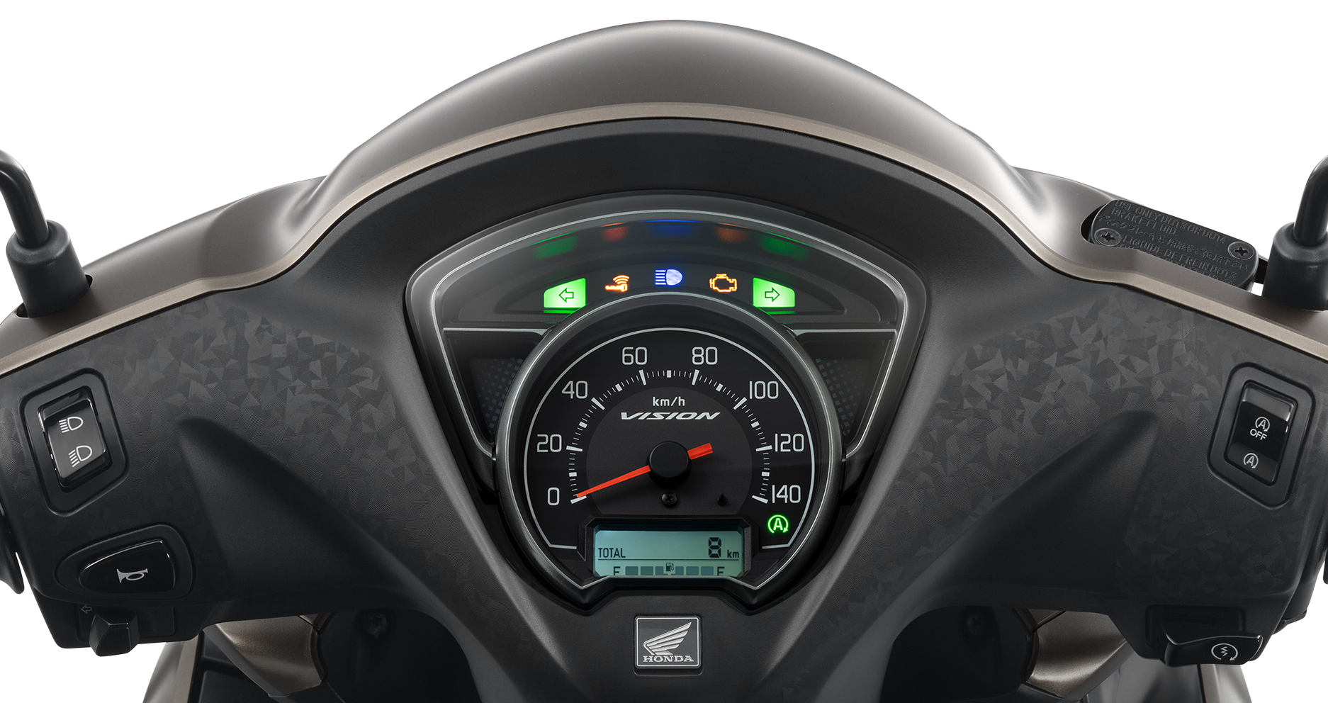 Màn hình LCD hiển thị số quãng đường và mức nhiên liệu. Hệ thống tự động ngắt động cơ khi dừng xe trên 3 giây và khởi động lại động cơ chỉ bằng thao tác vặn tay ga, giúp giảm tiếng ồn, tiết kiệm nhiên liệu và bảo vệ môi trường.